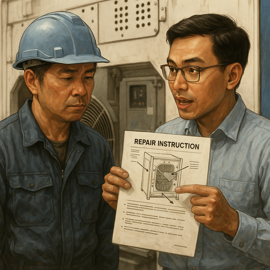 このイラスト言えば、左が日本人の修理作業を担当される方で、右がベトナム人エンジニアになります。状況としては、ベトナム人エンジニアが自分自身で作成した修理指示書を元に日本人の修理担当者のどのような修理を行うべきかを説明しています。